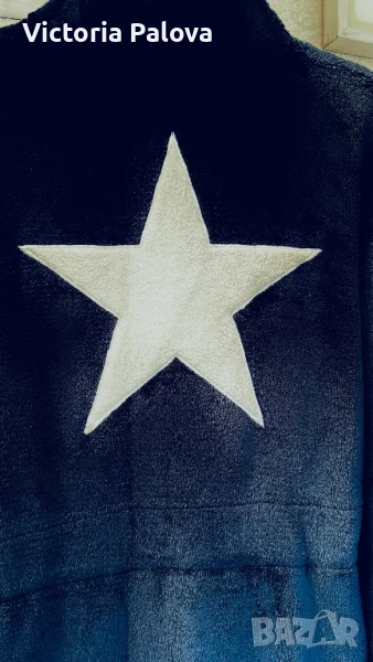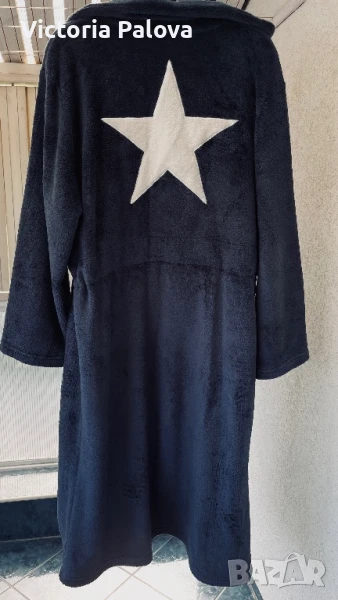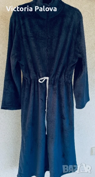 Халат или незаменима дреха за вкъщи , топъл и мек, лесно се поддържа, с цип и връв. Рамо - 52см, ГО - 64см, ханш - 64см, дължина - 120см, ръкав - 60см, цветът е сивосин.