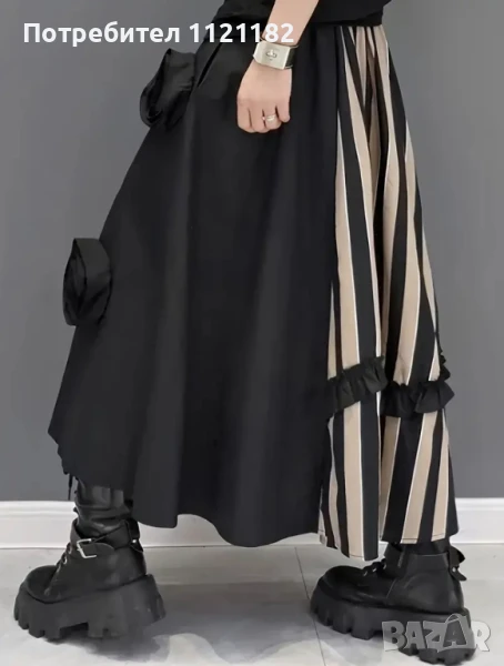Красива дамска пола.Едната половина е черна с две рози отстрани,а другата половина е на райета.С два джоба отстрани.Размера L.
