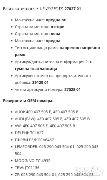 Носач Ауди ляв преден Lemforder → Обява 51302775