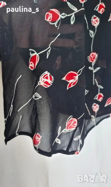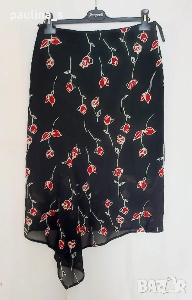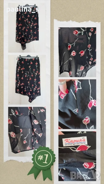 1️⃣. Колаж / M / L - "Карина". Цената е крайна 19,99лв / 10 евро. Копринена пола с хастар, българско производство. Цената е крайна. Изработена е много прецизно, моделът е с асиметрична платка отпред, даваща ширина и придаваща романтично звучене на дрехата. Отзад моделът е прав. Материята е немачкаема, шифон с прозрачност. Няма дефекти, нова-пиша използвана, защото няма етикет.