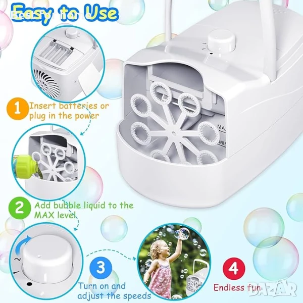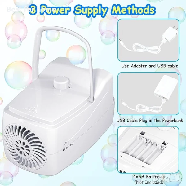 【Разнообразни опции за захранване】Изпитайте многофункционалността на нашата машина за балончета за деца с три опции за захранване - включете я в контакта, използвайте батерии или я вземете със себе си с външна батерия! Насладете се на балончета на закрито, на открито или в движение. Пригответе се за неограничено забавление с балончета с тази машина за балончета.
