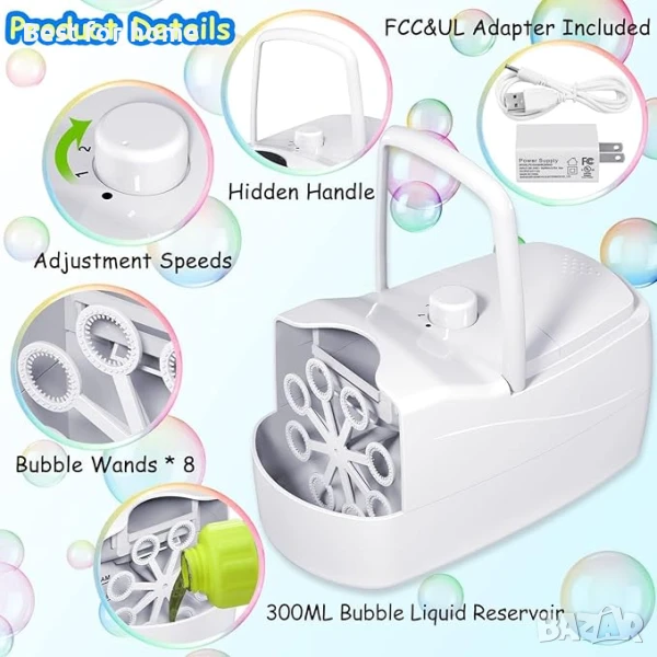 【18 000+ мехурчета в минута】В сравнение с други машини за балончета, нашата машина за балончета е оборудвана с 8 въртящи се дюзи и 2 скорости, които издухват хиляди мехурчета за минути. Спестете време и се забавлявайте повече, идеална за партита и събития.