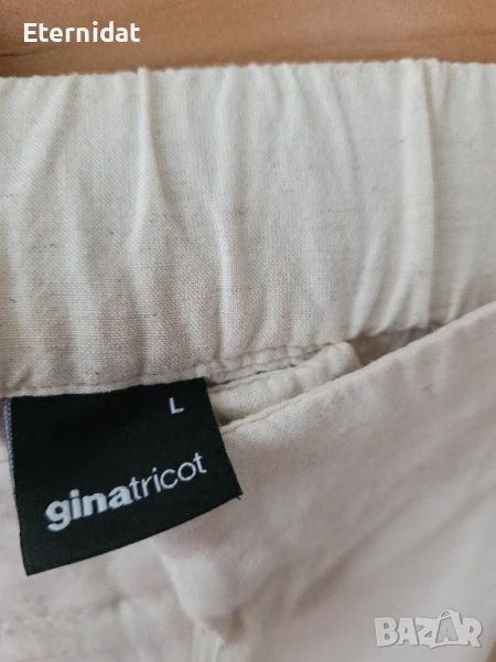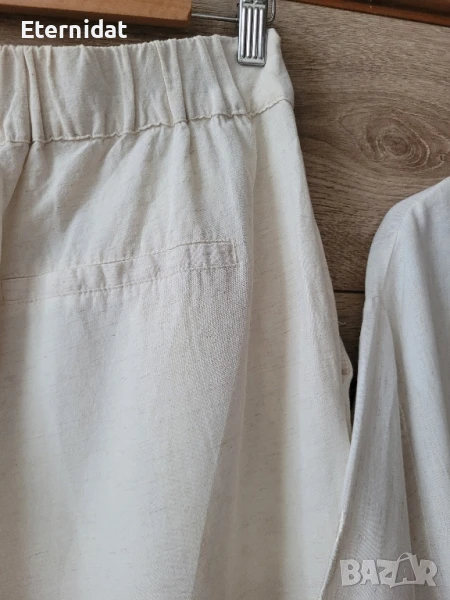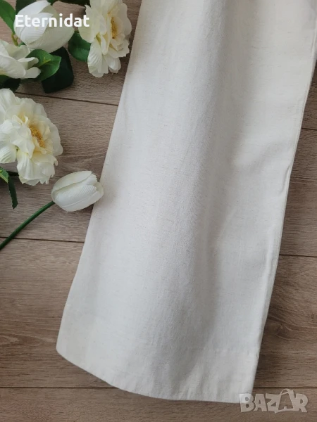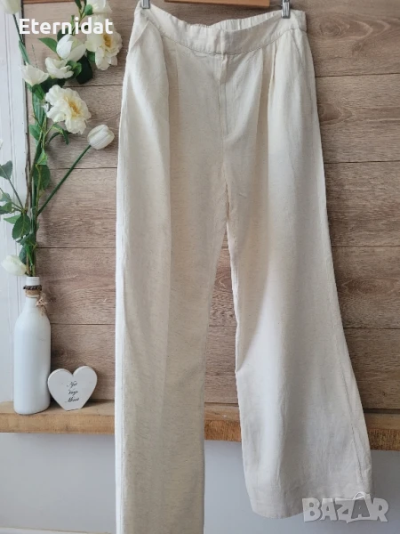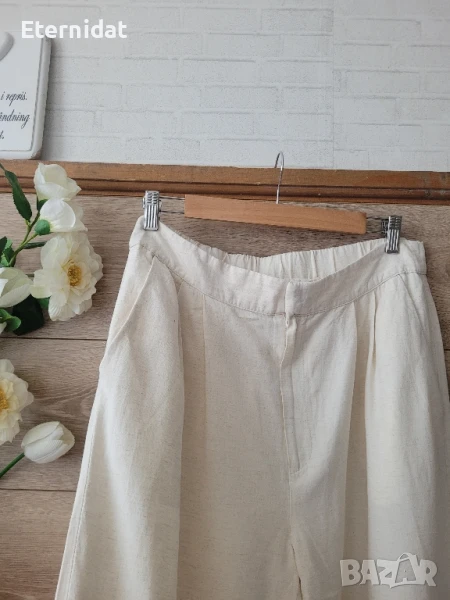 Летен ленен панталон широк крачол GIANATRICOT . Два странични джоба, ластик в талията. Прохладен , удобен и комфортен като усещане до тялото. Цвят шампанско. Размер Л, подходящ и за ХЛ. Талия в неразпънато положение 80см с еластичност до 92см. Надолу се разкроява. Цена 35лв