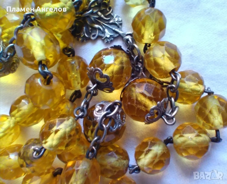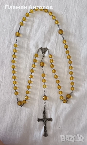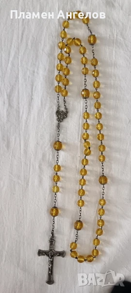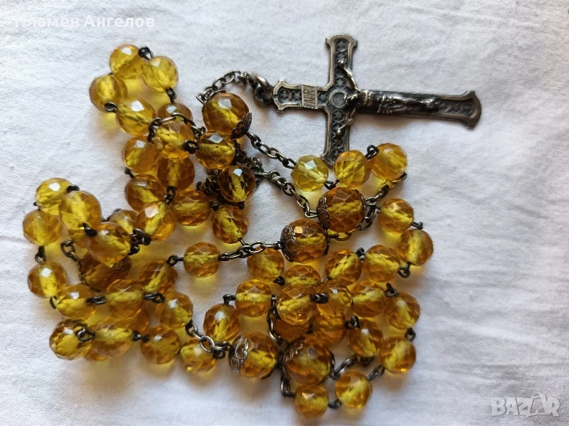 Антична молитвена броеница със жълти стари кристали. Сребърна плетка и сребърен кръст с Разпятие. Розариите са мощна форма на молитва и помощно средство при тайнство. Дължина на броеницата 61см.размери на кръста 6×3.5см и тегло 109грама.Цената е твърда. Има маркировка.