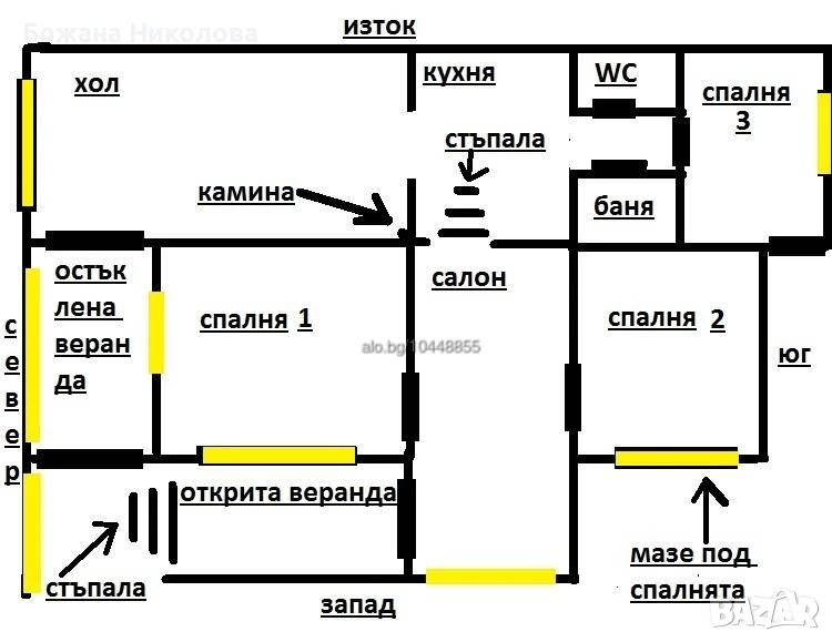 тоалетна, антре/салон, две веранди - остъклена и открита. Къщата разполага и с