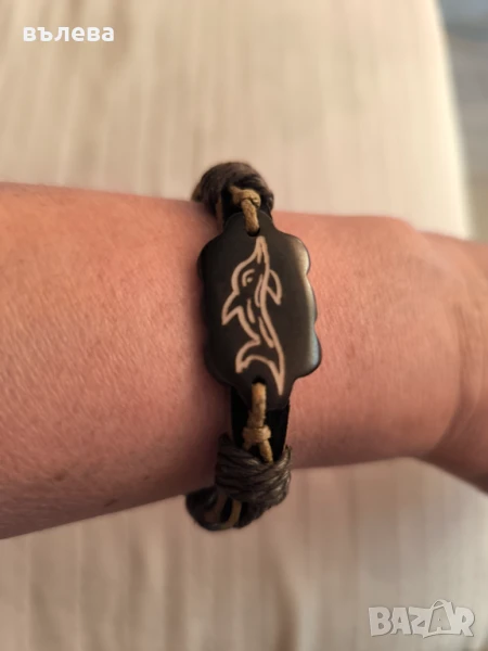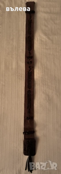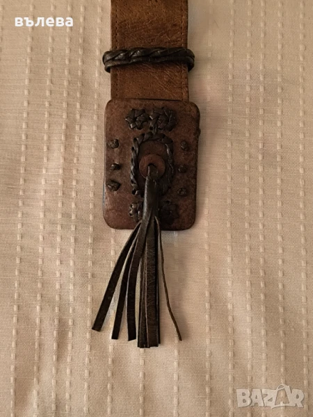 Дамски колан от естествена кожа с интересни мотиви,стабилно метално закопчаване и оригинална тока, дължина 82см, широчина 5см, талия 41см. Кожена,нова гривна (амулет делфин), дължина 20см и удължение 18см. Цвят кафяв.