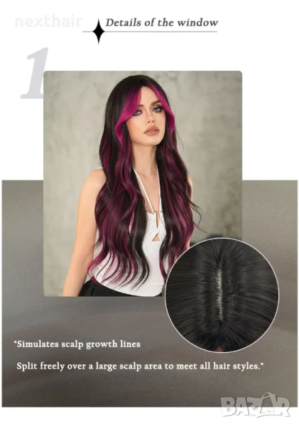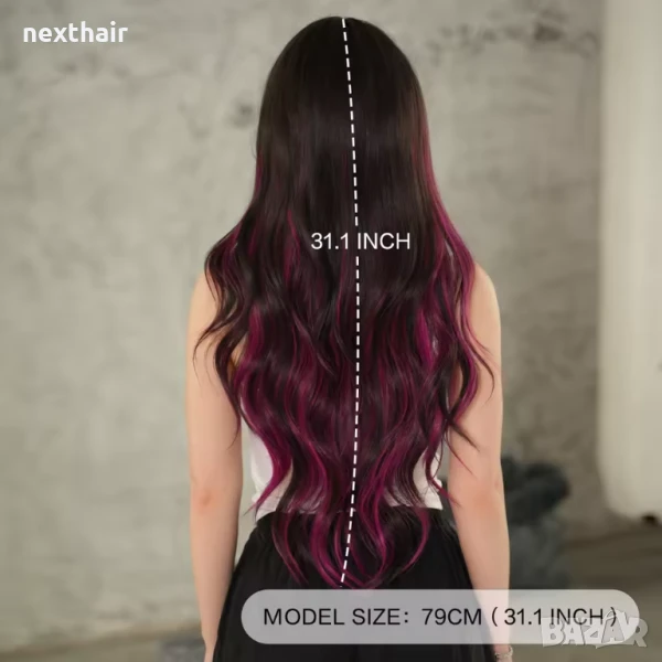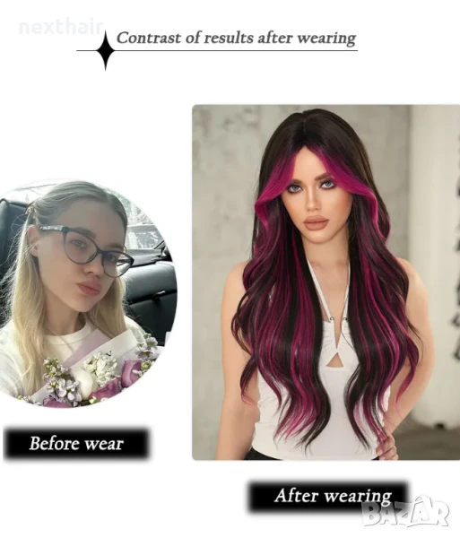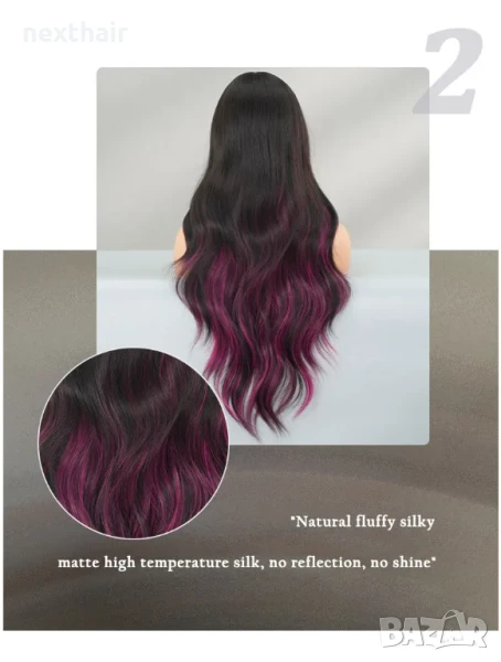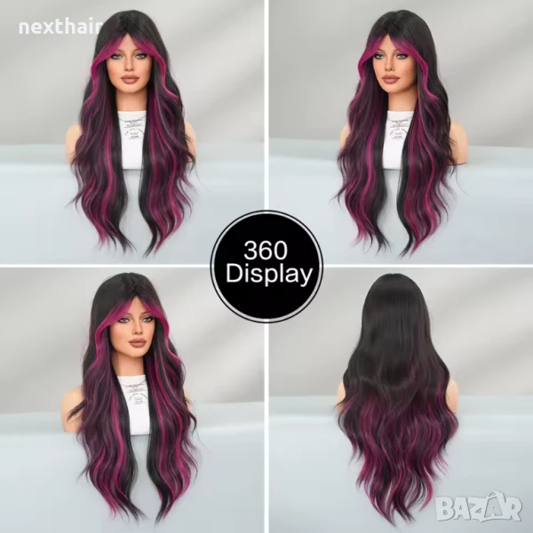Ефектна черна перука с розово цилама кичури с дълъг бретон → Обява 51313913