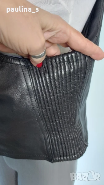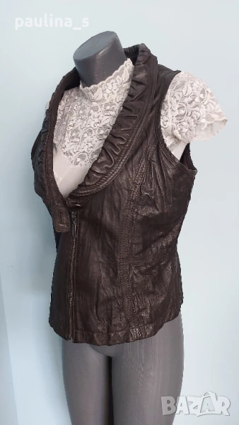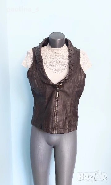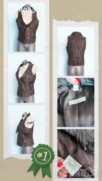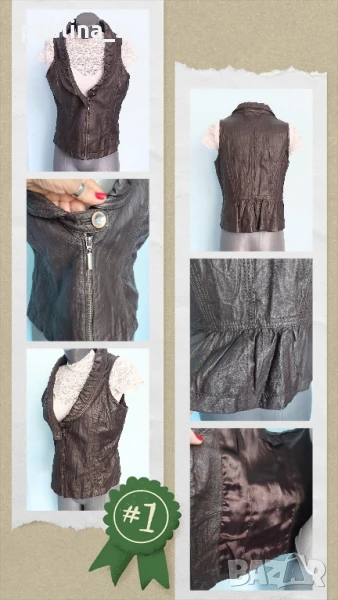 1️⃣. Колаж / XL / 2XL - "La ligna". Цената е крайна, без пазарлъци 58 евро. Естествена Кожа! Винтидж! Дизайнерски дамски елек модел или топ, от естествена кожа. Цветът е Срамежлива теменуга / Патладжан - лилаво, което минава и за тъмно кафяво. Кожата е здрава, без дефекти - с фабрично измачкан ефект. Моделът е втален с дълбоко деколте и ревер в ограничен набор, закопчаване с масивен здрав цип, отзад ханша се подчертава с кокетен набор. По етикет е 42EU, но става и за съседните.