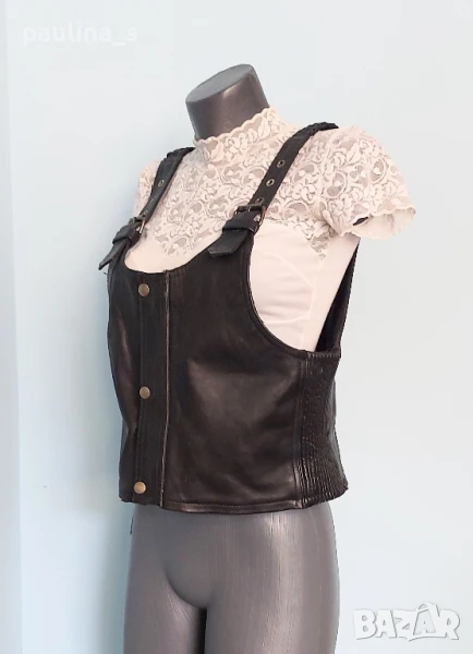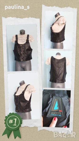 3️⃣. Колаж / XL / 2XL - "Akito". Цената е крайна, без пазарлъци 59 евро. Винтидж! Черен рокерски елек от естествена кожа. Рокерски елек "АКИТО", по етикет е М. Елекът е къс, по-скоро е гъзарийка, КОРСЕТ. Има тегелиран хастар с вата, дължината на презрамките се регулира с вшити ластици и токи, отстрани е също с ластици, стои по тялото като корсет. Долу имаше цип за скачване с панталон, но съм го махнала и ремонтирала за свободно носене. Може да се носи и от жени, и от мъже. Унисекс. Не е чисто нов, но няма дефекти по кожата, хастарът е реставриран.