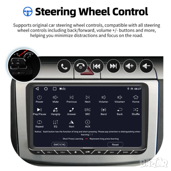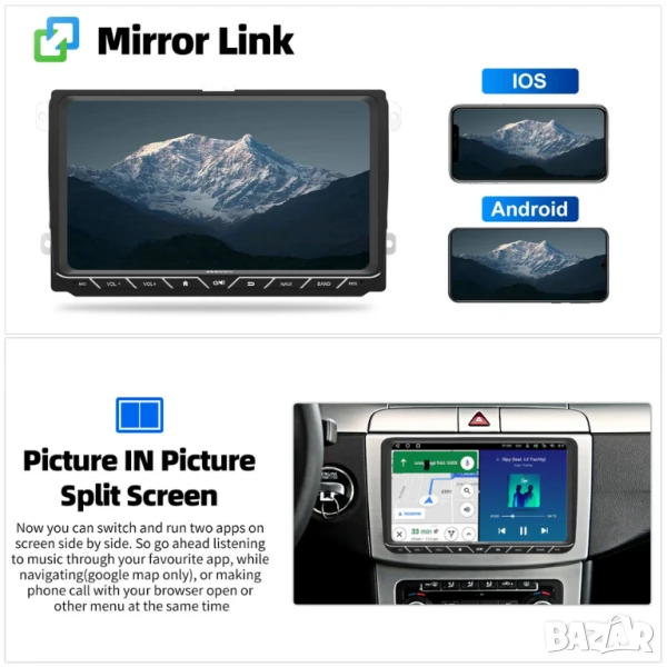 6. Mirror Link: Поддръжа свързанe с Iphone чрез Wifi Hotspot, свързване с мобилен телефон Android чрез USB кабел за данни. Изображението на мобилния телефон ще се показва на дисплея, също музика, видео, игри. За мобилни устройства с Android, сензорният екран може да управлява мобилния телефон.