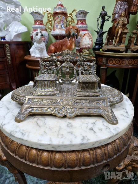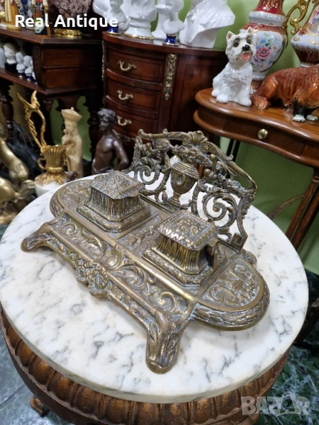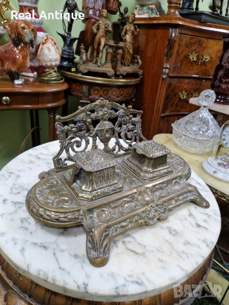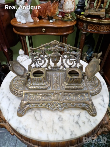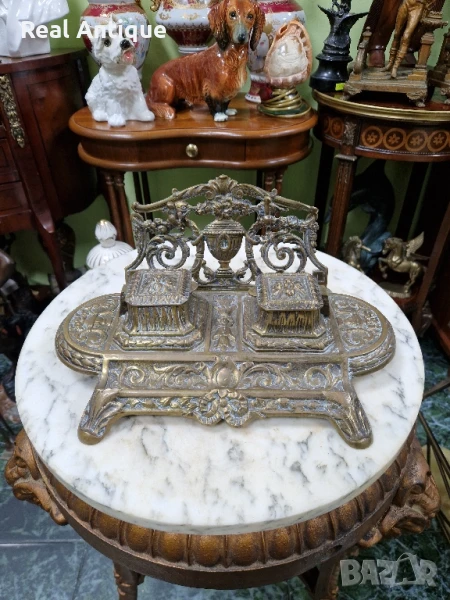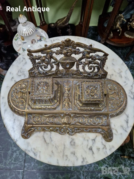 Продавам стара голяма прекрасна много детайлна антикварна френска бронзова мастилница в много добро състояние с наличните маркировки. Размери дължина 30 см ширина 20 см и височина 14 см. Чудесно допълнение към интериора на Вашия дом офис вила. Подходяща и за подарък. Работя с всички куриери. Отговарям бързо.