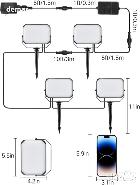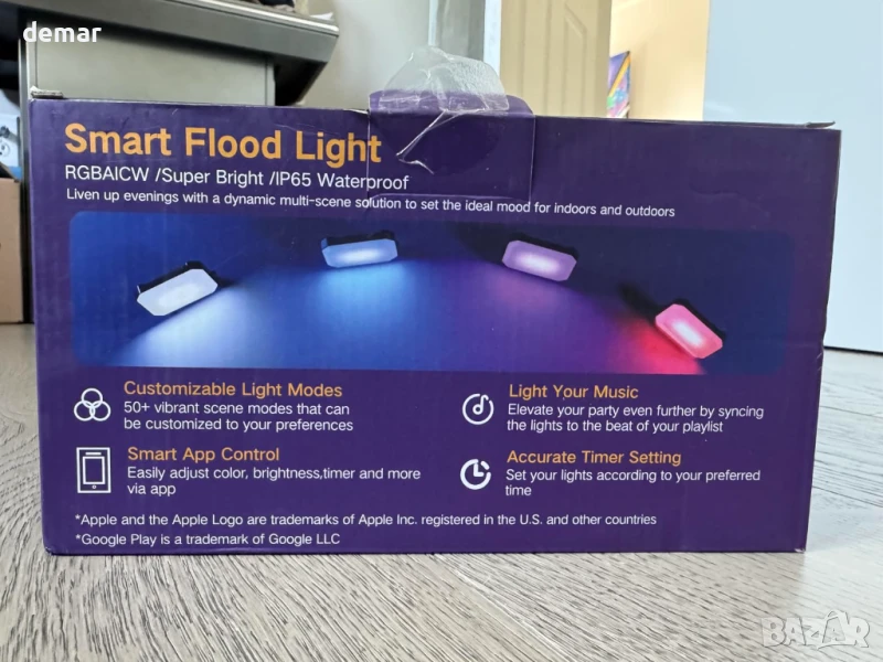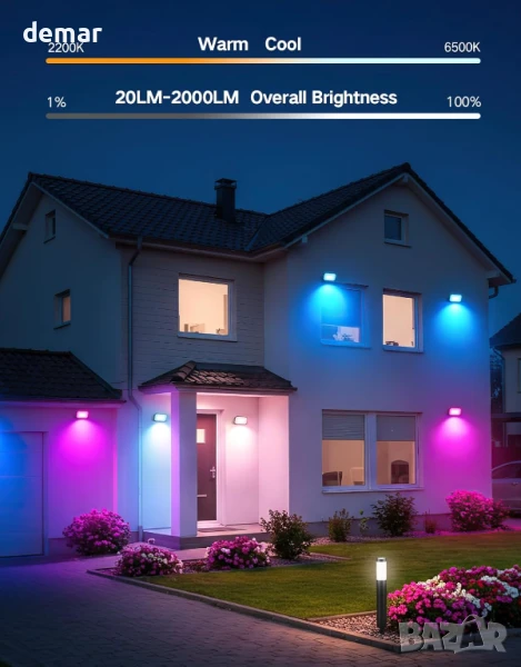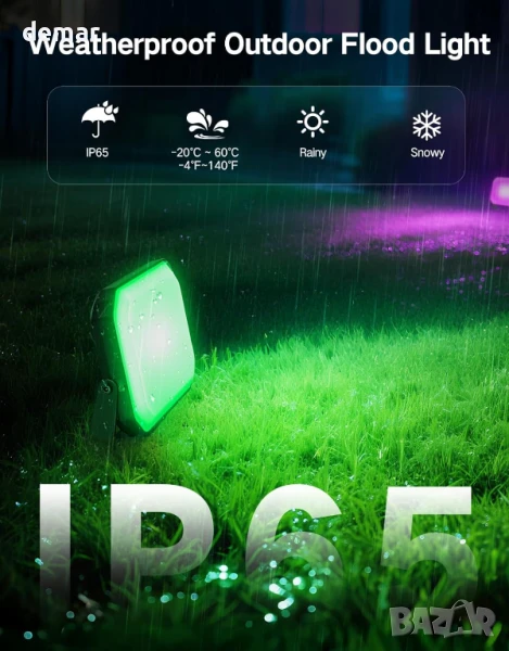 Този RGB прожектор предлага регулируеми топли и студени бели тонове (2200–6500K) плюс 16 милиона цвята, с контрол на яркостта от 1% до 100%, което го прави подходящ за ежедневна употреба, събития и празнична декорация. Поддържа приложение, дистанционно и гласово управление (Alexa/Google Assistant) за планиране, таймери и лесна работа навсякъде. Режимът на синхронизиране на музика променя цветовете, за да съответстват на ритмите, с 44 предварително зададени настройки и опции за „Направи си сам“ сцени за партита, игри и празници. Водоустойчивият дизайн IP65 издържа на екстремни метеорологични условия, осигурявайки целогодишна надеждност на закрито или на открито. Инсталацията е бърза, с опции за стенен и наземен монтаж, а и четирите свързани лампи работят от един кабел. Захранващ адаптер: IP44, моля, включете адаптера в покрит външен контакт. Поддържа само 2.4GHz Wi-Fi.
