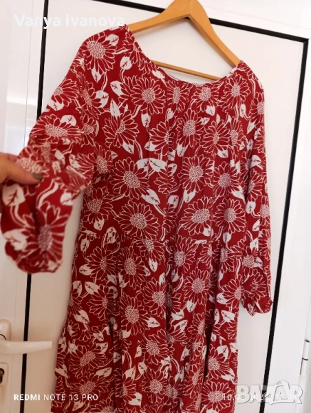 Роклята стои свободно , не прозира,не описва. На ръкава, който е 7/8 има ластик и може да стане по-къс.