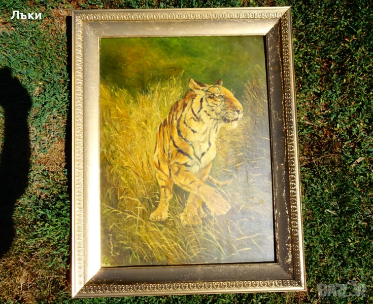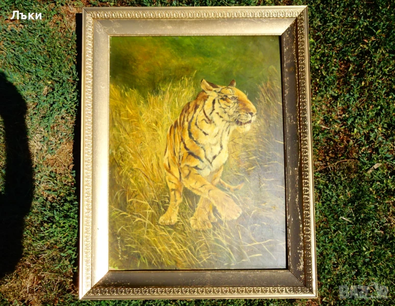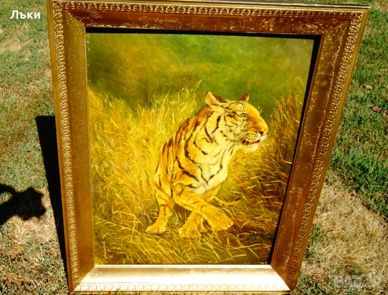 Стара авторска картина Тигър,сред висока трева – млад,силен