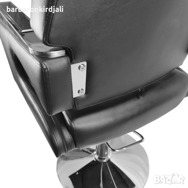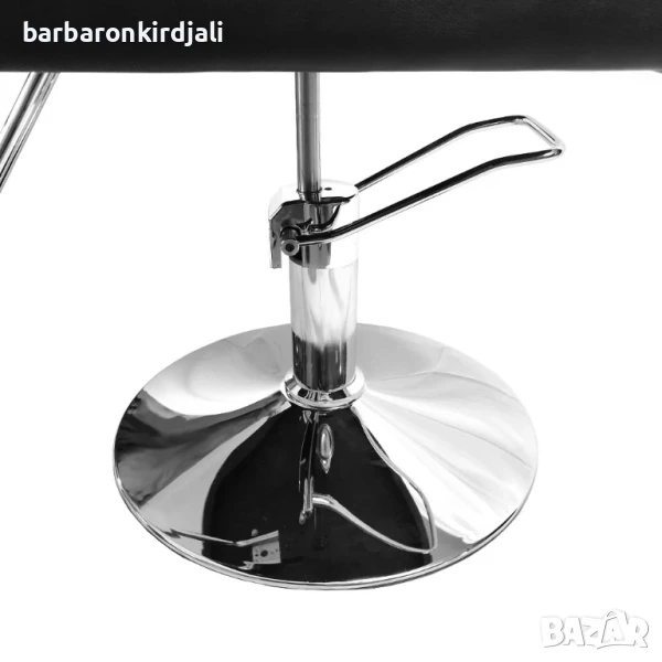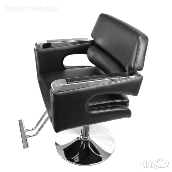 Бръснарски стол, регулируем по височина, с поставка за краката. Столът е идеален и се вписва във всеки фризьорски салон. Елегантен и ергономичен стил. Черната еко кожа е хигиенична и практична. Оборудван е с поставка за крака, която го прави много удобен за клиента. Има удобен механизъм за регулиране на височината.