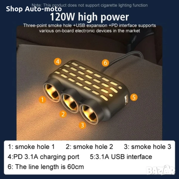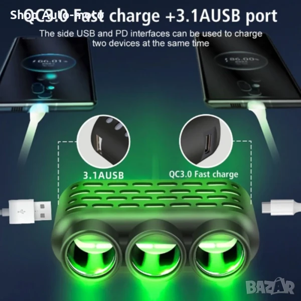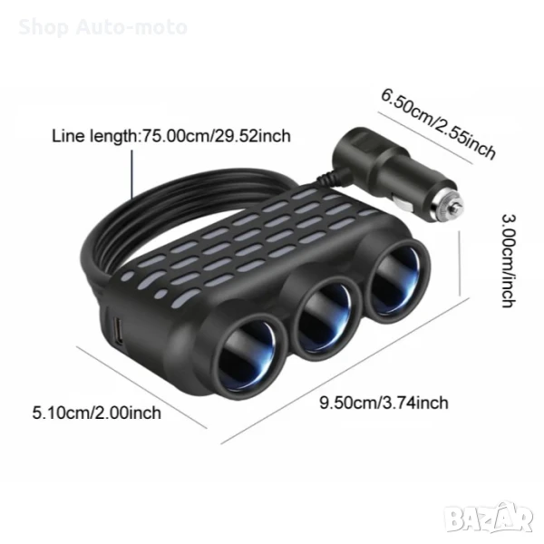 Разклонител за запалка с 3 гнезда. Луксозен разпределител за захранване от един към три гнезда, красив външен вид, изящна изработка, удобен за едновременно използване на различни електрически уреди във всяко превозно средство, за да отговори на вашите нужди.