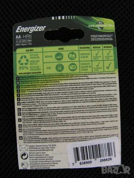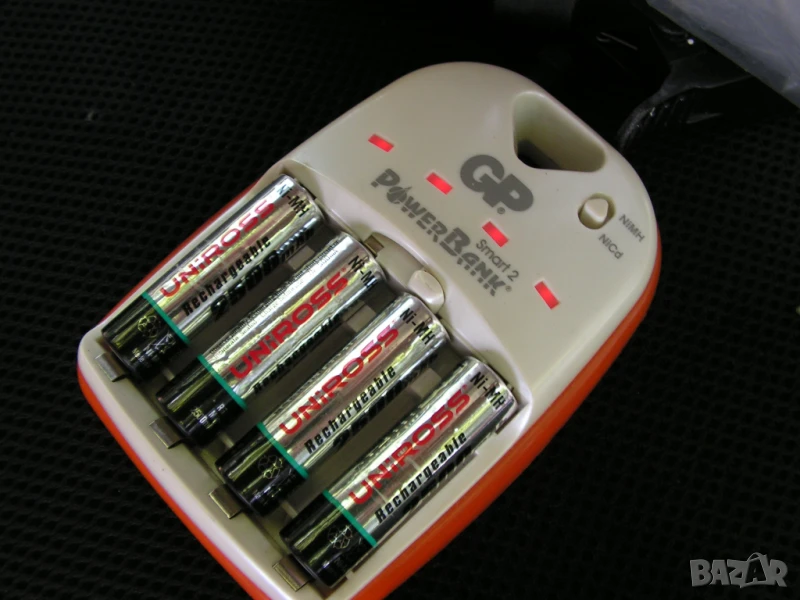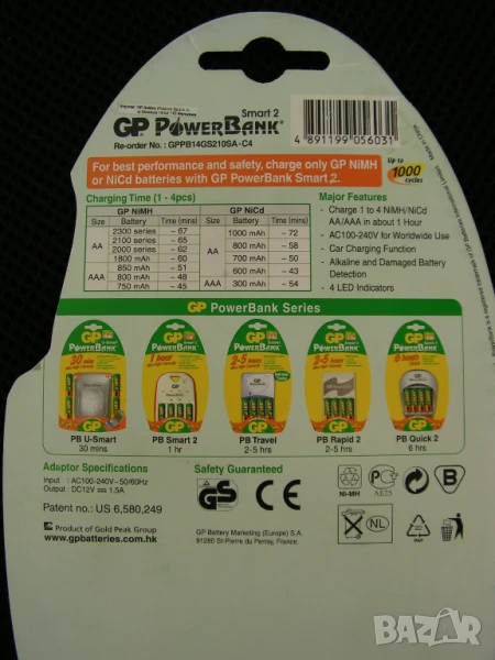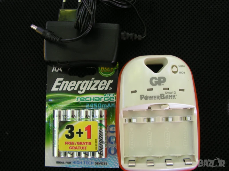 Предлагам ново зарядно устройство GP Power bank Smart 2 за 4 бр акумулаторни батерии тип АА ( R 6 ) или ААА (R 03) с 4 броя нови неразпечатани, японски, акумулаторни батерии ENERGIZER – AA (R 6) 2450 mAh . Зарядното е изработено в завода на GP в Хонг Конг. Ново е и е разпечатано за проба и снимки. Устройството се захранва с изработен в Китай за GP захранващ адаптор GPPB14GSSA (100-240v 50-60Hz 0,15A max) 12V 1500 mA. Зарядното устройство разпознава неизправните акумулатори и индикира за наличието им. Само изключва при пълно зареждане.