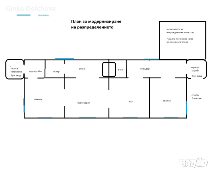 Къщата е с плоча между етажите, в добро конструктивно състояние, но за ремонт, което дава възможност за модерно преустройство и ново разпределение. Има изградена баня на първия етаж. Два самостоятелни входа – подходяща и за две семейства.
