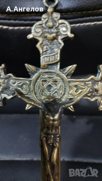 Бронзов, старинен кръст с разпятие. Масивен, богато инкрустиран. Дължина- 21см.