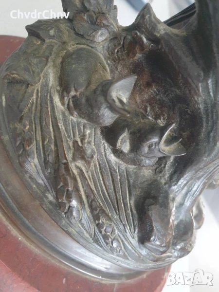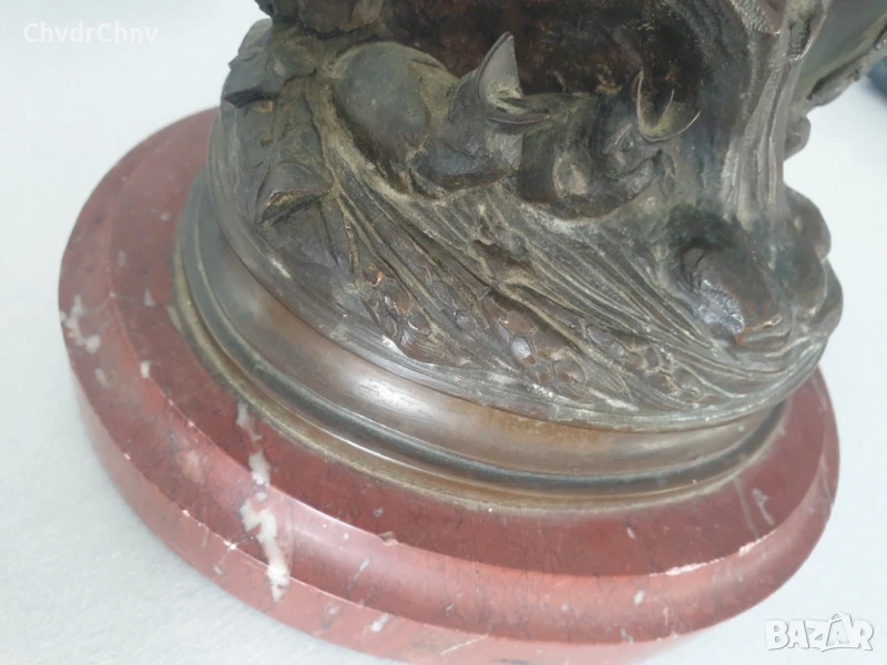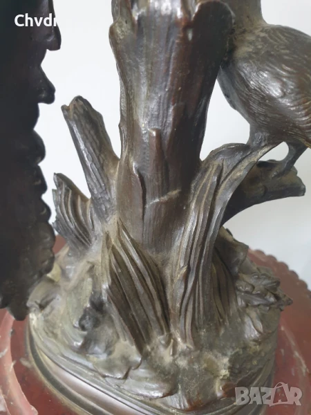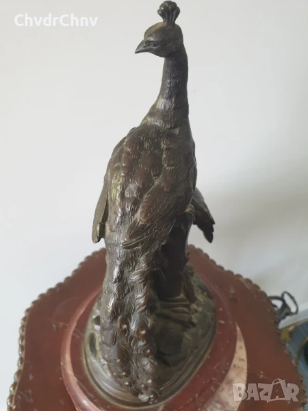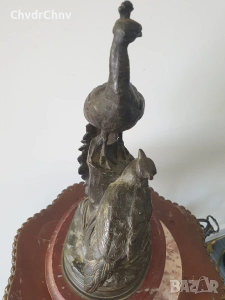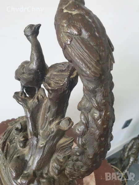 Материалът е плътен бронз, не е куха, основата е елипсовиден кафяво-червен мрамор, стара (Франция 19-ти век),, детайлна, изобразява пауни (мъжки и женски) с две малки пилета в основата.