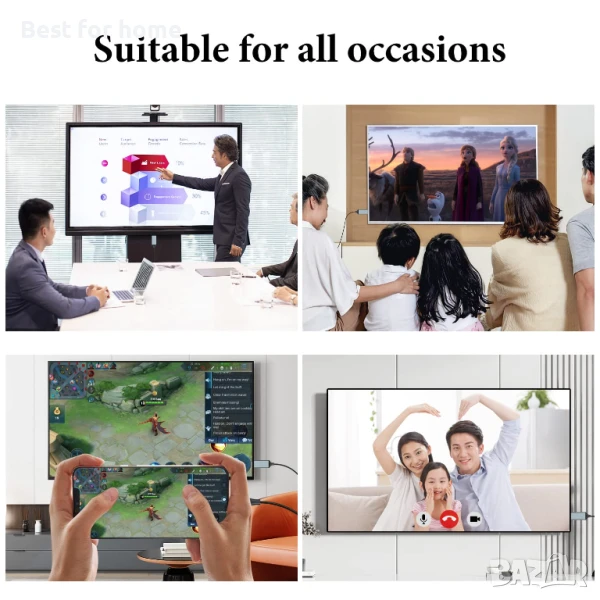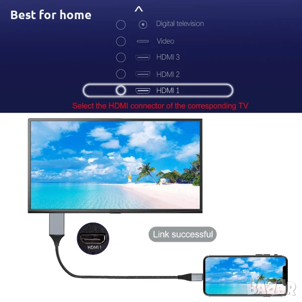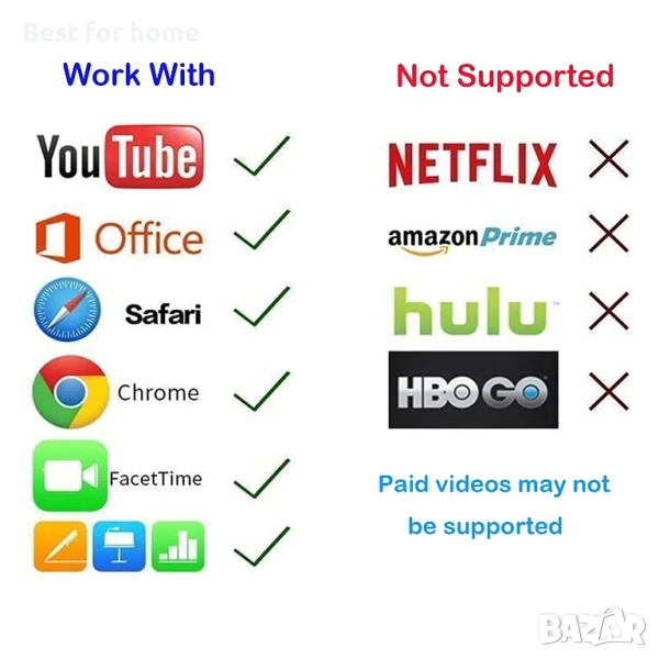 [ПРИЛОЖЕНИЯТА И МОДЕЛИ НЕ СЕ ПОДДЪРЖАТ] Поради мерки за защита на авторските права, HDMI кабелите на телефона може да не поддържат платени видеоклипове в Netflix, HBO GO, Xfinity Player, Hulu, Directv, Vudu и други приложения. ЗАБЕЛЕЖКА: Не се поддържат модели с USB-C интерфейс: iPhone серия 16/15;