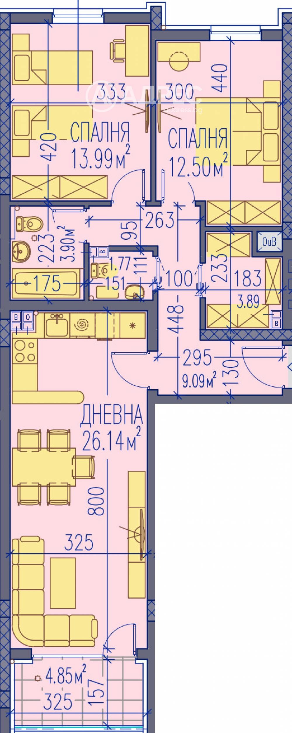 Състои се от дневна с трапезария, 2 спални, баня и тоалетна, 2-ра тоалетна, дрешник, терасa