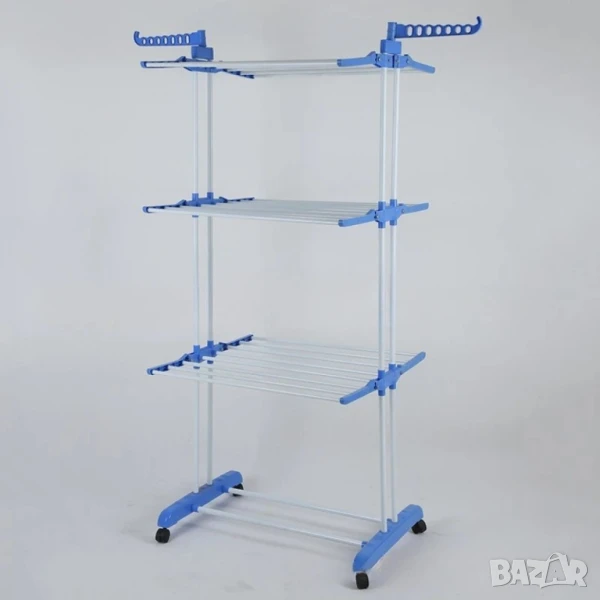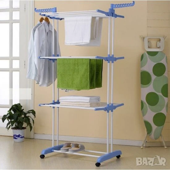 Вертикален сушилник за дрехи на колелца Три нива. Представяме ви практичният сушилник за дрехи с 3 нива и опора за закачалки, един изключително удобен и функционален уред, който ще направи сушенето на вашите дрехи лесно и удобно. Този вертикален сушилник за дрехи е проектиран с голямо внимание към детайлите и функционалността, което го прави идеален за всеки дом. Сушилникът се отличава с големите си размери, които позволяват простирането на голямо количество пране. Този аспект е от особена важност, особено за семейства с много дрехи за изсушаване.