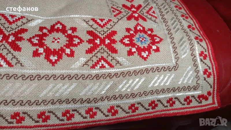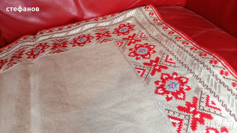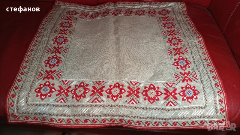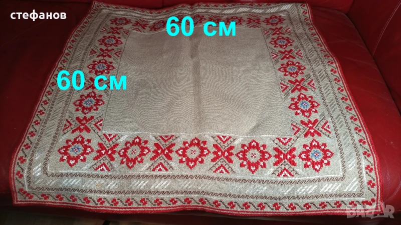 Моля да зачетете внимателно текста към обявата, защото в него е обяснено подробно. На въпроси отговарям тук на съобщение от Вас. Активна ли е обявата може направо да си поръчате харесаното. Ленена основа, копринени конци. Не е ползвано, отлично състояние, без забележки. Размерите са 60 см на 60 см, квадратно. За ползване или пък битова стая. Изпращам добре опаковано по Еконт с опция преглед преди да се плати. Куриерската услуга е за сметка на купувача, но подготвям товарителницата през Базарбг и по тази