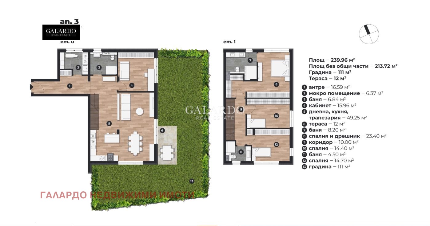 Мезонетът е с чиста площ от 205 кв.м и прилежаща градина от 119. кв.м.