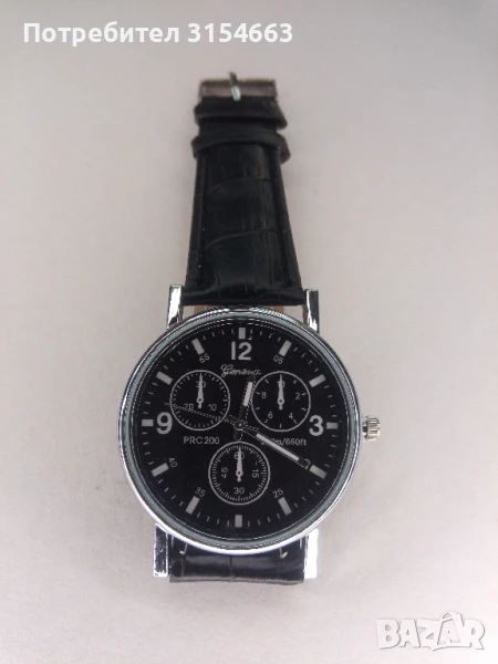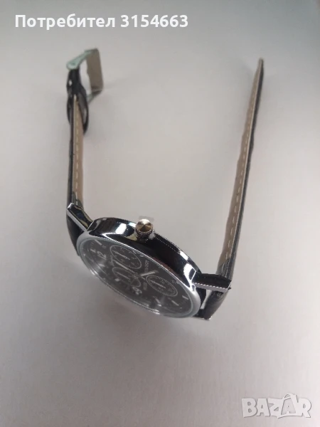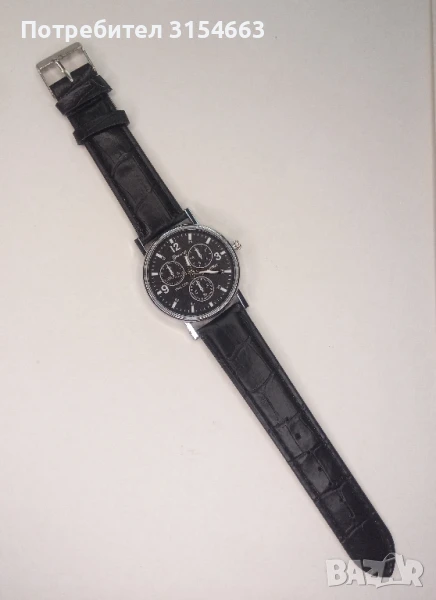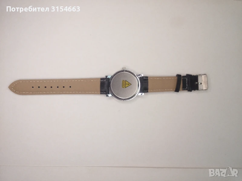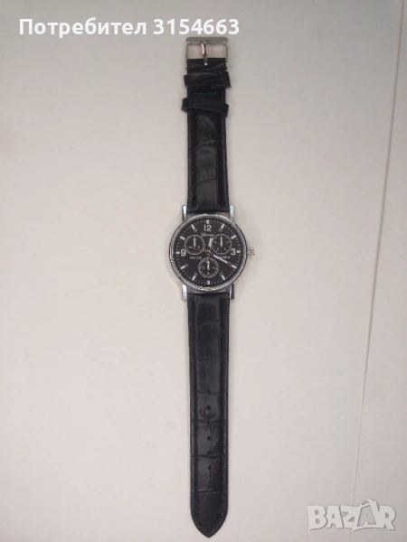 Мъжки часовник - кварцов, светещи стрелки, кожена каишка, закопчалка тип катарама. Диаметър 3,6 см. Дебелина на корпуса 0,7 см. Лентата е с дължина 23 см и ширина 1,8 см.