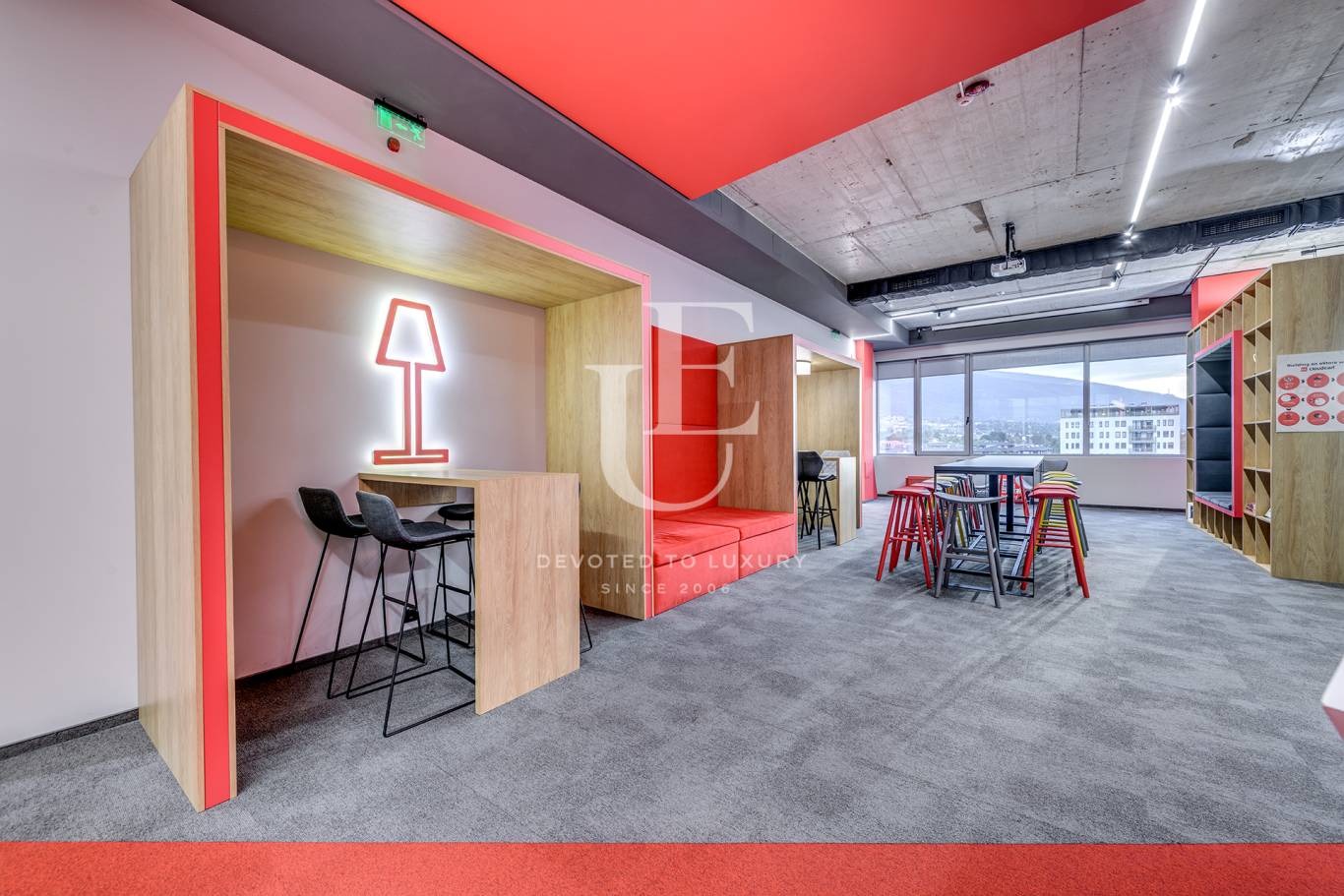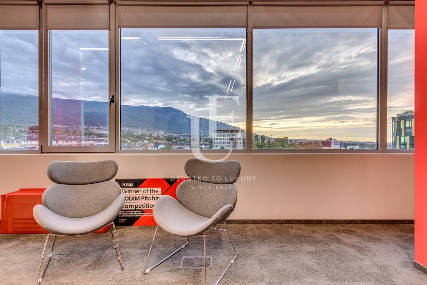 Пространството впечатлява с изчистен и модерен дизайн, отлична естествена осветеност и завладяваща гледка към планината и града.