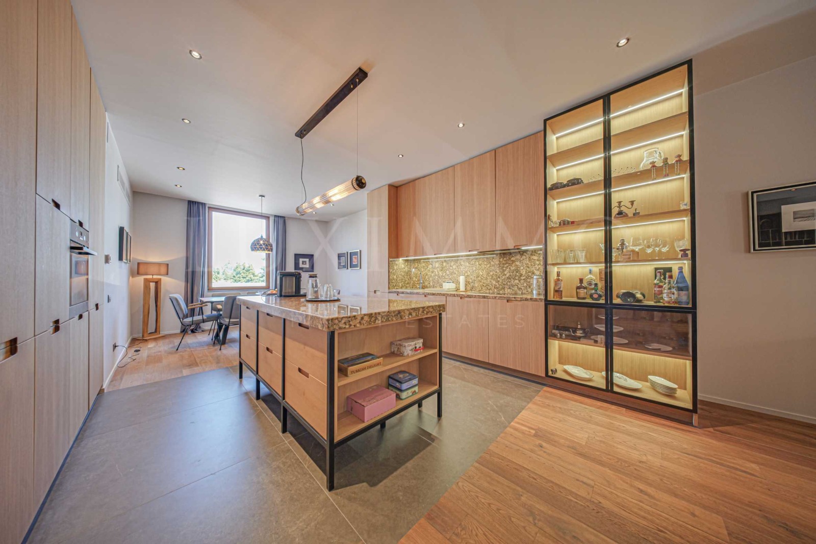 Етаж 1 - Просторната всекидневна, кухнята и трапезарията са обединени в отворен план, като от тях има директен излаз към веранда с висок бор и орех идеално място за отдих или семейни вечери. Големият кухненски остров и пълното оборудване с висок клас електроуреди създават отлично пространство за кулинарни приключения. Обстановката е топла и стилна естествен паркет, камина на дърва, елегантни линии и меки, земни тонове.