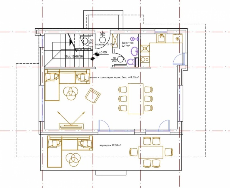 хол, трапезария, кухня, баня/тоалет и голяма веранда на първия етаж;