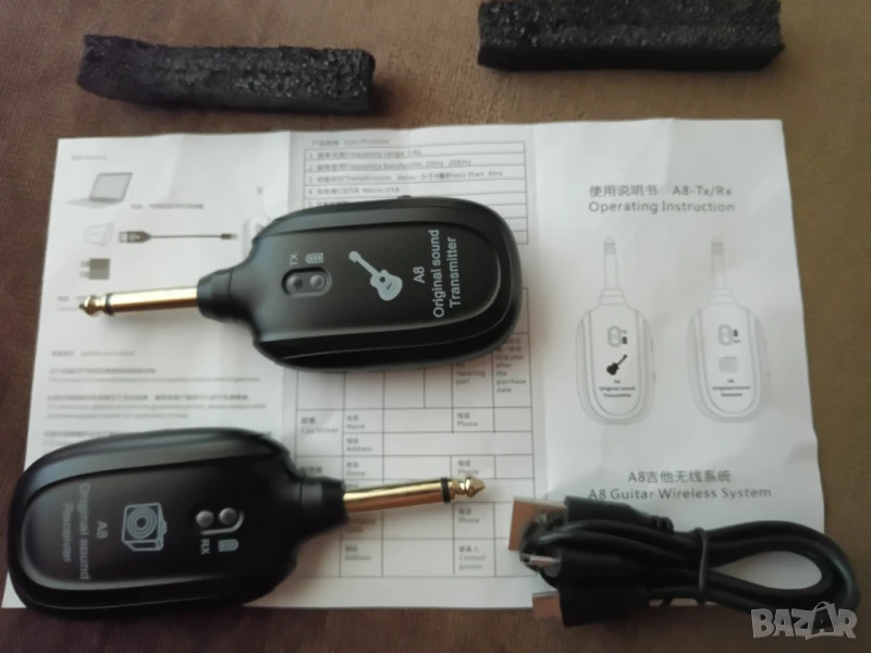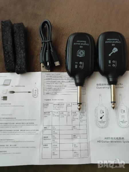 Безжична връзка между електрическа китара и усилвател или кубе. Време за зареждане на вградената литиева батерия 2-3ч, продължителност на използване 3-4ч, дистанция 30-40м, до4ms закъснение на сигнала. Компактен 10/4/2см, много практичен комплект- 35лв предавател за китарата(25лв) и приемник за усилвателя (25лв) с USB кабелза зареждане за електроакустични китара, бас, цигулка, укулеле и др.