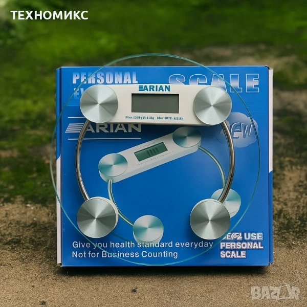 Стъклен дигитален кантар до 150кг от марката ARIAN, със съвременен и елегантен дизайн. Идеален за измерване на теглото в домашни условия.