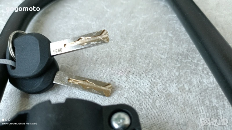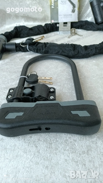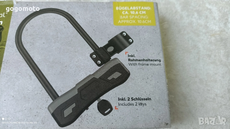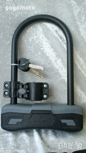 Катинар П образен за мотор, колело, велосипед. Всички данни са на снимките Моля вижте фото Цената е за брой стоманен П образен скоба катинар с размери на отвора 10.6 см.