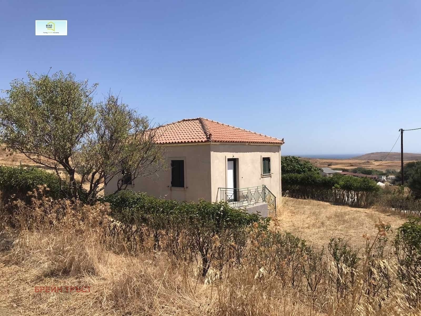 Braintrust Ви предлага имот с гледка в село Каминия на остров Лимнос. Къщата е на един етаж - 54,4 кв.м. Включва в себе си две спални, трапезария с кухненски бокс и баня с тоалетна. Целият парцел е 520,72 кв. м.