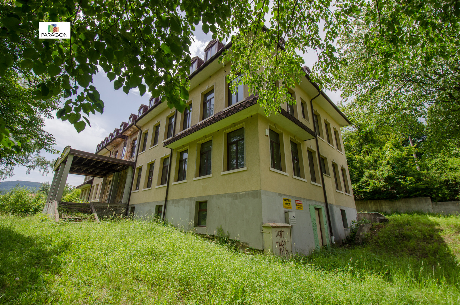 За да разгледате още оферти, заповядайте в нашия обновен и модерен сайт на адрес paragon-bg.com.АТРАКТИВЕН ИНВЕСТИЦИОНЕН ИМОТ в гр. Габрово подходящ за Хотелски комплекс, Възстановителен център, Дом за възрастни хора и др. Имотът се намира южно от центъра на гр.Габрово, кв. Хаджицонев мост, на подстъпа към туристичeски център Узана и в близост до трасето на бъдещия тунел Шипка. Комплексът е най-подходящото съчетание между градски и планински тип в близост до града, същевременно на тихо и слънчево място с чист планински въздух и панорамна гледка към Стара планина. Районът е с изградена инфраструктура с добра транспортна достъпност в близост до пътя за географския център на България, местността Узана и в близост до бъдещия тунел под Шипка. В терен от 6 320 кв.м е изградена триетажна масивна сграда със сутеренен етаж с разгъната застроена площ 1 704 кв.м. Сградата е реконструирана с проект за хотелски комплекс с капацитет 50 места, с оставащи довършителни работи. Изпълнена е външна топлоизолация и мазилка, без северна страна, монтирана ПВЦ дограма, вътрешни и външни ВиК инсталации. На първи етаж са предвидени фоайе с рецепция и лоби бар, заседателна зала, ресторант с кухненски тракт. На втори и трети етаж са разположени 17 бр. двойни стаи /антре, стая, баня-тоалетна/, 4 апартамента /антре, две стаи, баня-тоалетна/ и два камериерски офиса. В сутерена са разположени басейн тип джакузи, сауна, парна баня, предвидени са помещения за лекарски кабинет, мокър и сух масаж, обособени са котелно, перално и битови помещения. Сградата е с изградена асансьорна шахта с достъп до всички нива. Теренът е с добра транспортна достъпност с големи възможности за допълнително застрояване, изграждане на открит басейн, спортни площадки, лятна тераса и др. Обектът се предлага със закупено обзавеждане за хотелската част включващо: легла, гардероби, нощни шкафчета, огледала, бюра с хладилни отделения. Дължи се ДДС върху незастроената