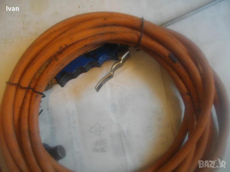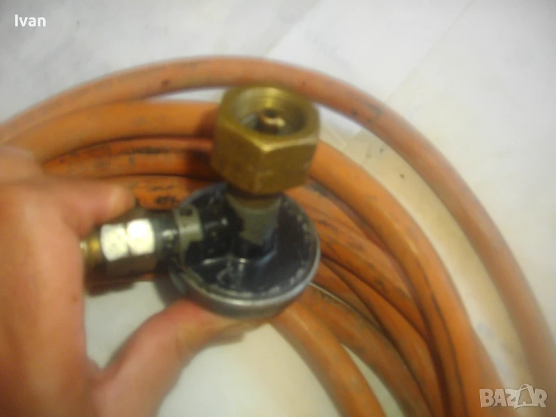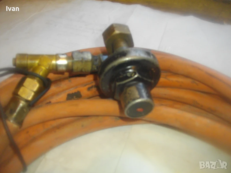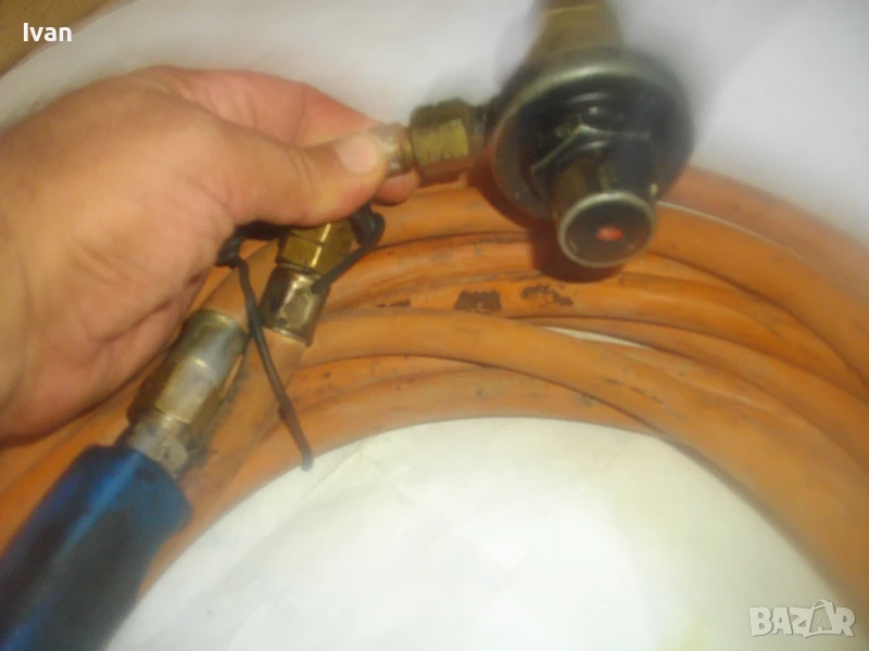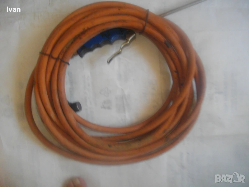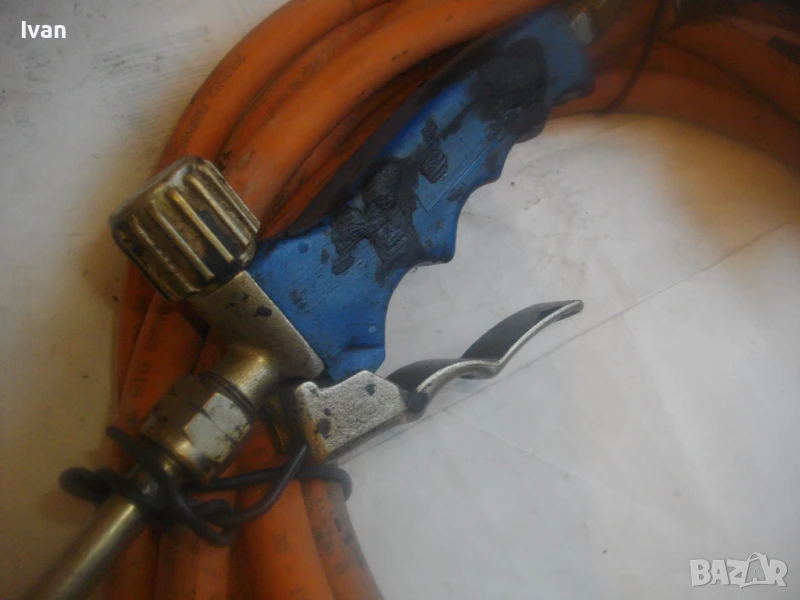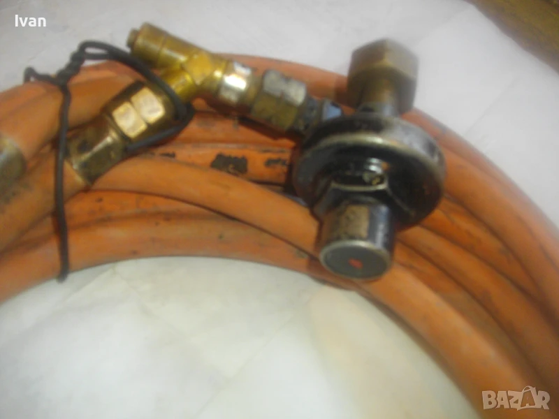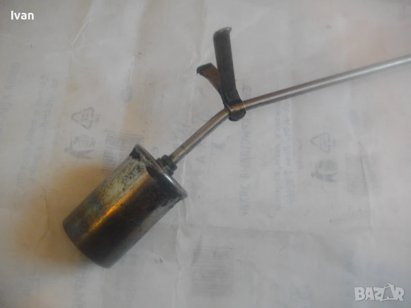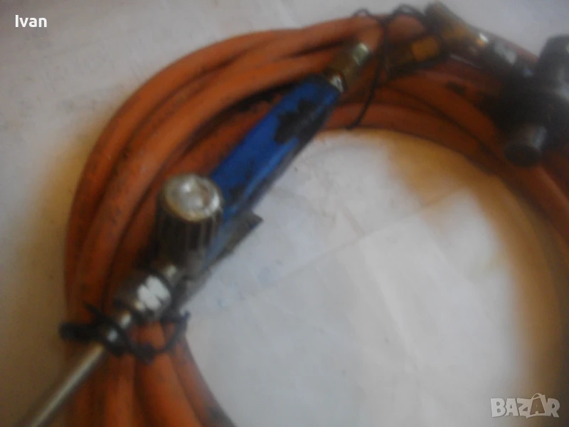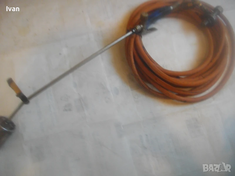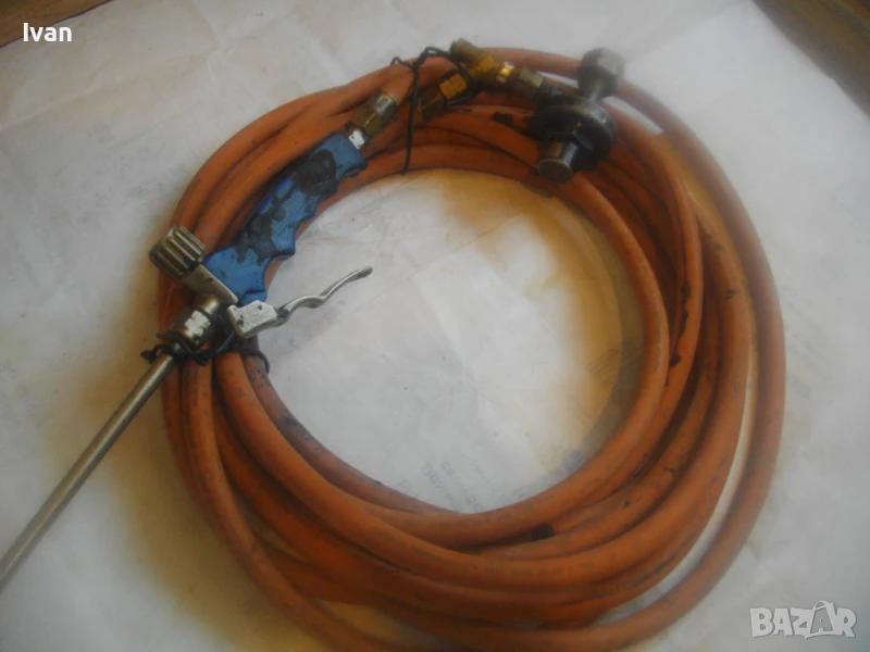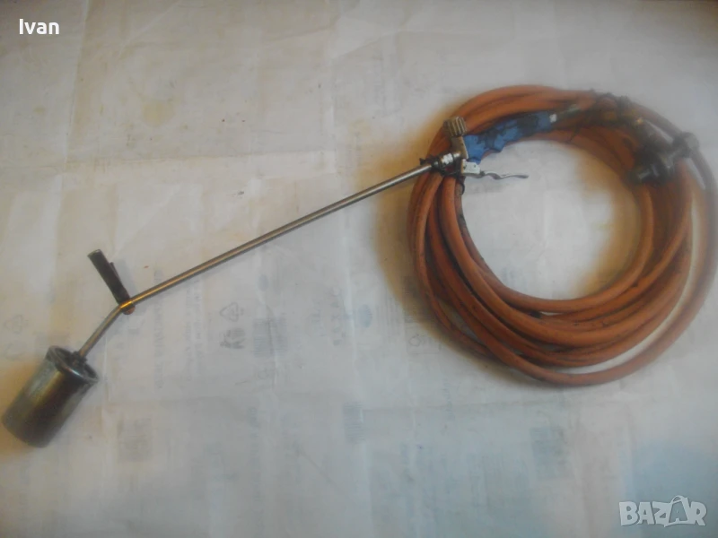 Масивна газова горелка за покриви и хидроизолации, работеща на газ пропан-бутан. Немска оригинална, масивна. Ползвана, с леко захабен външен вид /леки остатъци от смола/, в отлично работно състояние. Дължина на горелката 77 см, чаша дюза отпред ф60 мм масивна от плътно желязо, пластмасова дръжка с дълъг, удобен метален спусък. Скачен оригинален маркуч с дължина 5 м и размер ф 11 мм, в отлично състояние, без никакви напуквания. Скачен оригинален немски масивен редуцир вентил в пълна изправност. Алуминиев върток спирателен кран. Налична оригинална стойка за самостоятелен обърнат стоеж.Тегло на комплекта - 3,0 кг. .
