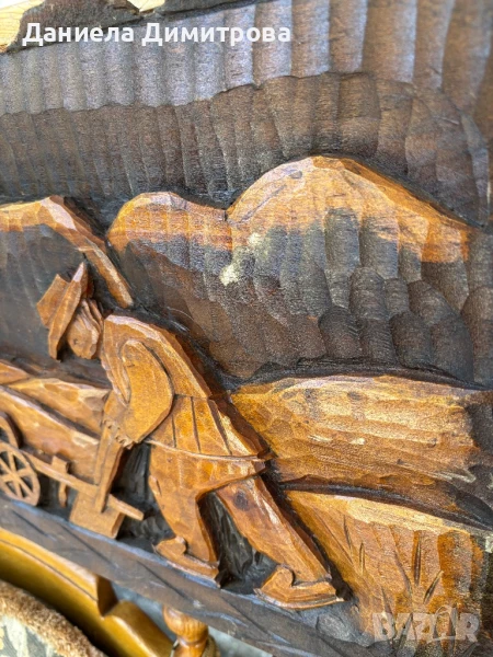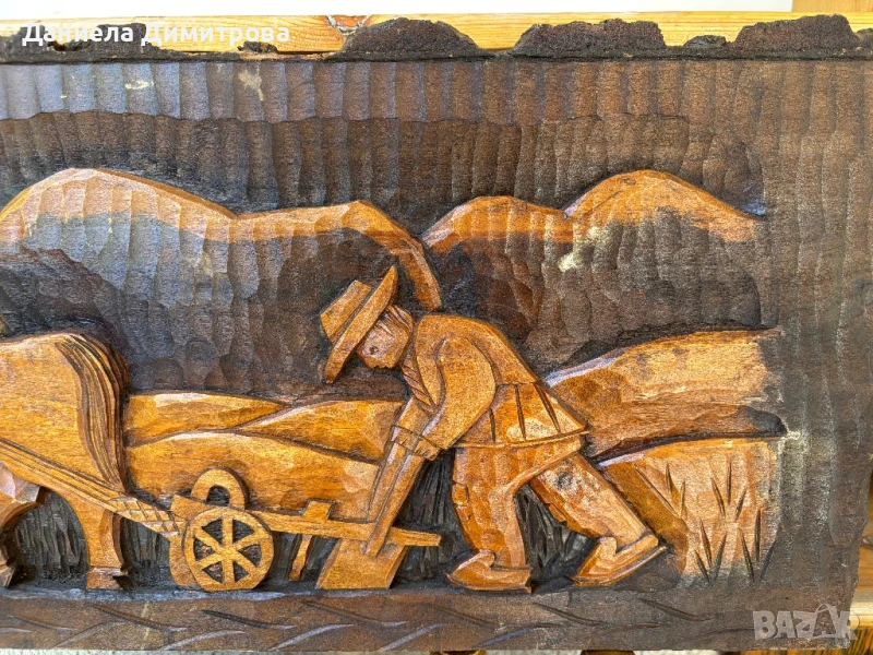 Стенна дърворезба с релефно изображение на мъж с плуг и кон → Обява 51333736