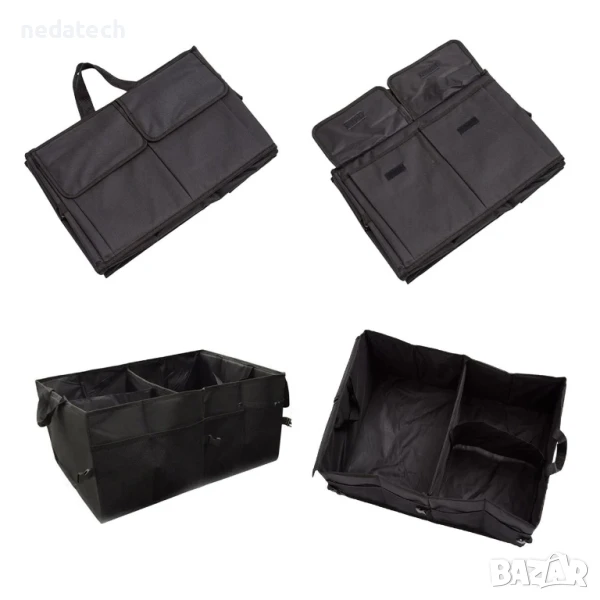 Органайзер за кола с 2 големи отделения 37x27x25см или едно отделение 37x27x25см и 2 по-малки отделения 18x27x25см (има допълнителна преграда с лепяща лента). Разполага с 2 външни мрежести джоба и 2 джоба. Сгъва се, има дръжки и пластмасови щипки за пълно затваряне, лесен е за почистване и е подходящ за големи и малки предмети, инструменти, почистващи препарати, спортна екипировка или дори пазаруване. Съхранявайте и организирайте най-необходимите неща за вашия автомобил.