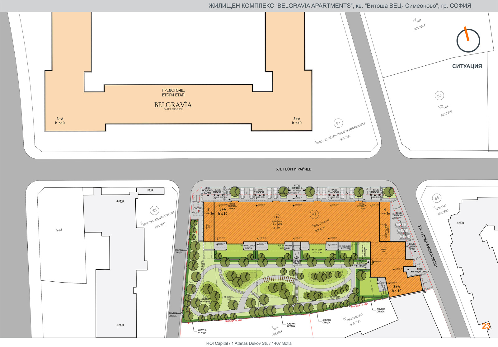 ROI Capital има удоволствието да Ви представи Belgravia Apartments: един проект насочен към хора, които мислят в перспектива. Луксозната жилищна сграда от ново поколение се изпълнява от ELITE Building Company, като съчетава в себе си редица световни иновации в посока енергийна ефективност, екологичност, устойчивост и висока технологичност. Нейната атрактивна локация я прави идеален избор както за Вашия бъдещ дом в гр.София, така и за инвестиционните Ви намерения с цел отдаване под наем или бъдеща препродажба. Разположена е в зона с преобладаващо нискоетажно строителство и охолни отстояния от съседни сгради, което осигурява тиха и комфортна среда за живот с панорамни гледки към Витоша и центъра на града. В непосредствена близост предстои да се реализират метростанция и публичен парк. Сградата впечатлява с отличаваща се архитектура, елегантна фасада, безупречна функционална схема и богато озеленена градина с детска площадка. Прецизно строителство с материали от най-висок клас и ниво на изпълнение без аналог в района.