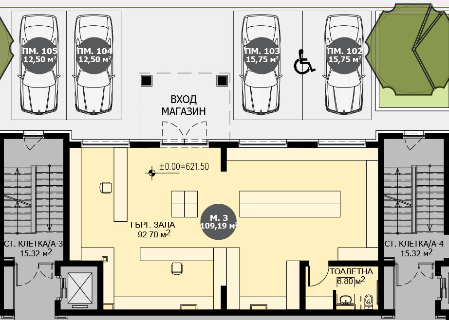 Магазин 3, разположен на партерен етаж. Изложение: север. Разпределение: Търговска зала отворено пространство и санитарен възел. Чиста площ 109,19 м² + 19,37 м² общи части (15 %). Четири вида схеми на плащане с възможност за отстъпки от стойността на магазина! 100% подсигурено банково финансиране за изграждането на проекта!