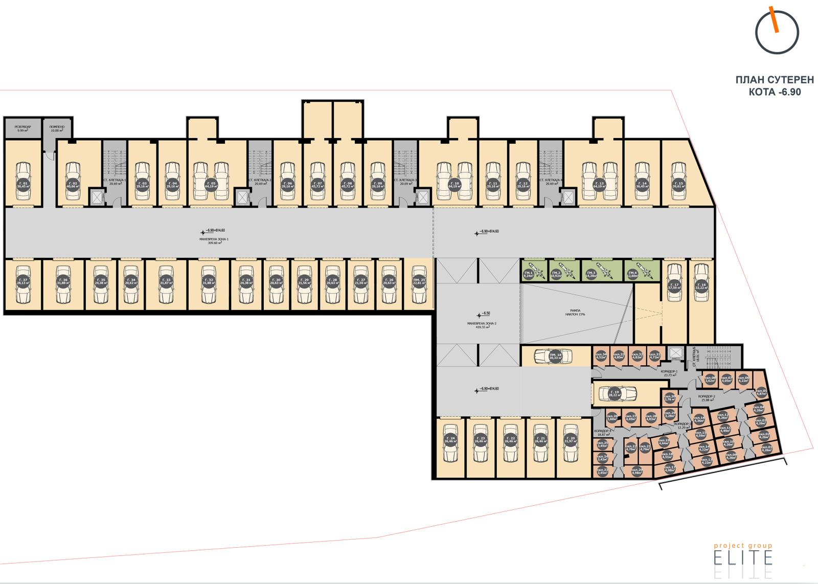 Сутерен и гаражи: Гаражни автоматични врати NOVOFERM; Настилка от шлайфан и полиран бетон и рампа с подгряване. Трифазен ток и гарантирана мощност за монтаж на бързозарядни станции за електромобили във всеки един от гаражите.