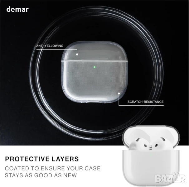 AirPods 4, изработен от 100% рециклирани материали без BPA, предлагащ цялостна защита с устойчиво на надраскване и пожълтяване покритие, прецизни изрези за лесен достъп и изчистен дизайн, който подчертава стила на вашето устройство.