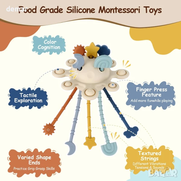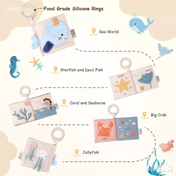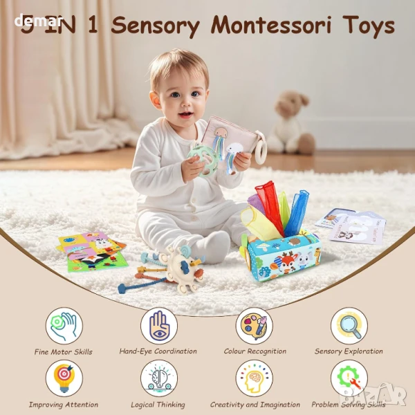 Този подаръчен комплект за бебешко парти включва картички за важни моменти, силиконова играчка за дърпане с текстурирани въжета и мехурчета за двигателни умения и сензорна игра, кутия за меки кърпички с нагъната материя, шалове и огледало за изследване, цветна книжка за бебета с животинска тематика и тактилни страници за визуална и слухова стимулация и сензорна топка за разтягане, хващане, търкаляне и дъвчене. Проектиран да подпомогне ранното развитие, разпознаването на цветовете, фината моторика и когнитивния растеж, той предоставя разнообразие от ангажиращи, образователни и сувенирни елементи за бебета на възраст от 3 месеца до 1 година.