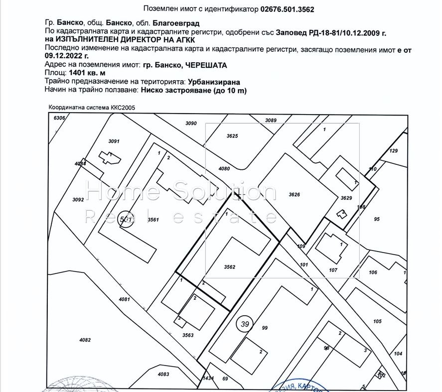Продава се поземлен имот в урбанизирана територия с площ от 1401 кв.м, разположен в местност Черешата, гр. Банско.