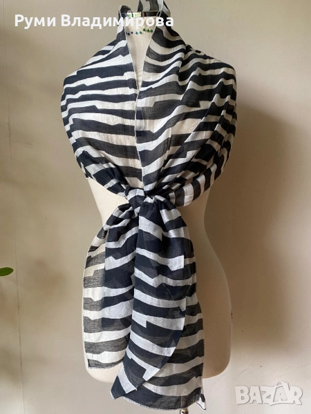 Раиран шал в черно и бяло, зебров принт, тънък шал, прозрачен, с шев по краищата, размери 184 Х 39 см, доставка с Еконт.