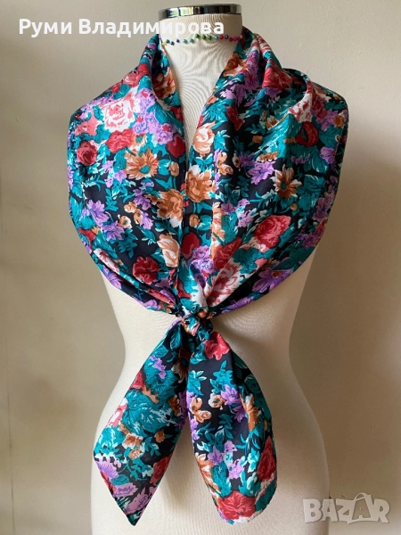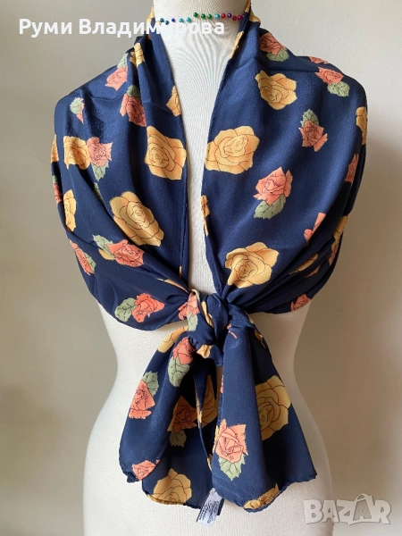 Тъмносин шал на жълти рози от 100 % коприна, плътна коприна, размери 35 Х 158 см, подходящ и като кърпа, лента за коса, нов, доставка с Еконт.