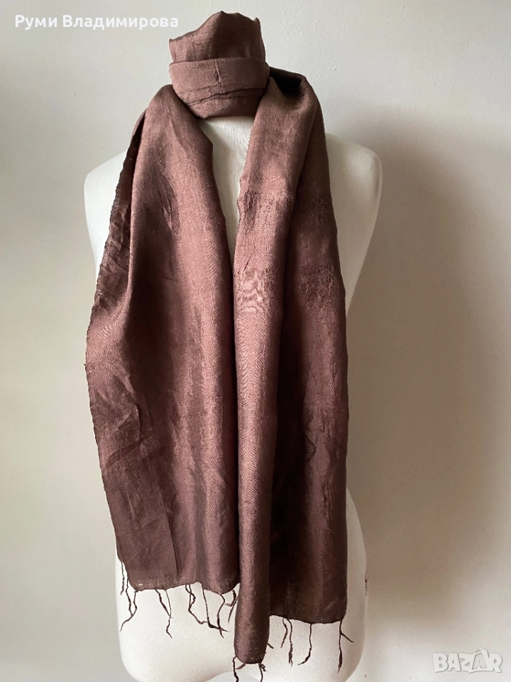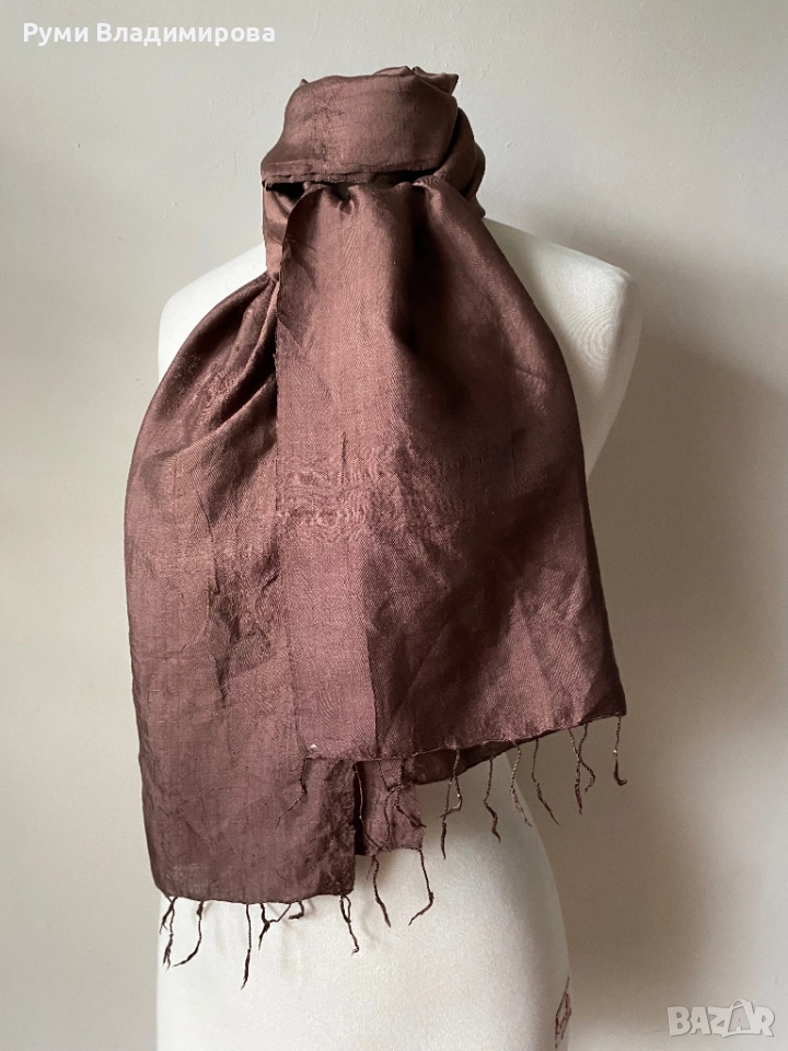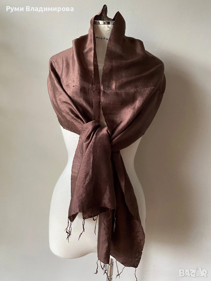 Шоколадово кафяв шал от сурова коприна/ вижда се тъкането на материята/ , с ресни, плътна, лъскава коприна, идеален за съчетаване с бежова дреха, нов, доставка с еконт.